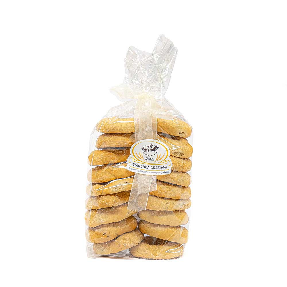 Ciambelline vino bianco e anice 250g. Preparate sempre con la nostra farina tipo1 di grano tenero, risultano molto friabili e deliziosi.