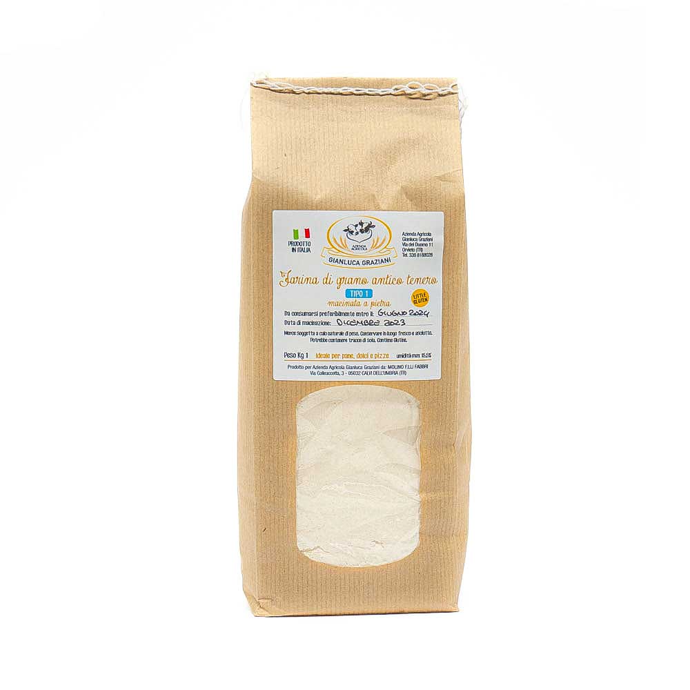 Farina di Grano Antico tipo1 da 1kg è ottenuta da una varietà denominata “Gentil Rosso”. Macinata con mulino a pietra è caratterizzata da un ottimo tenore proteico e poco glutine. risulta più digeribile e nutriente ed ideale per Pane, Pizza, dolci.