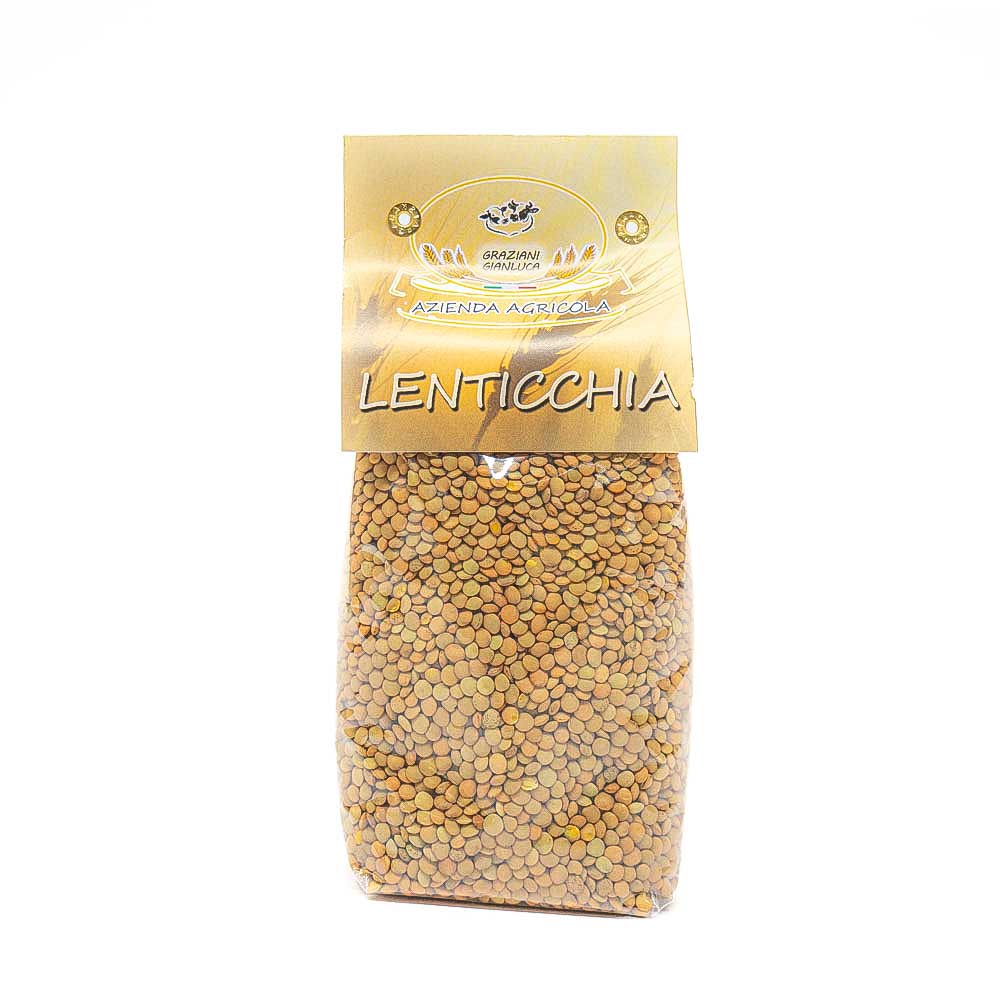 Lenticchie 500g. Coltivate nei nostri terreni, si presenta con un seme molto piccolo e una buccia molto soffice sottile. Non necessita di ammollo ed ha una cottura di 20-25 minuti.