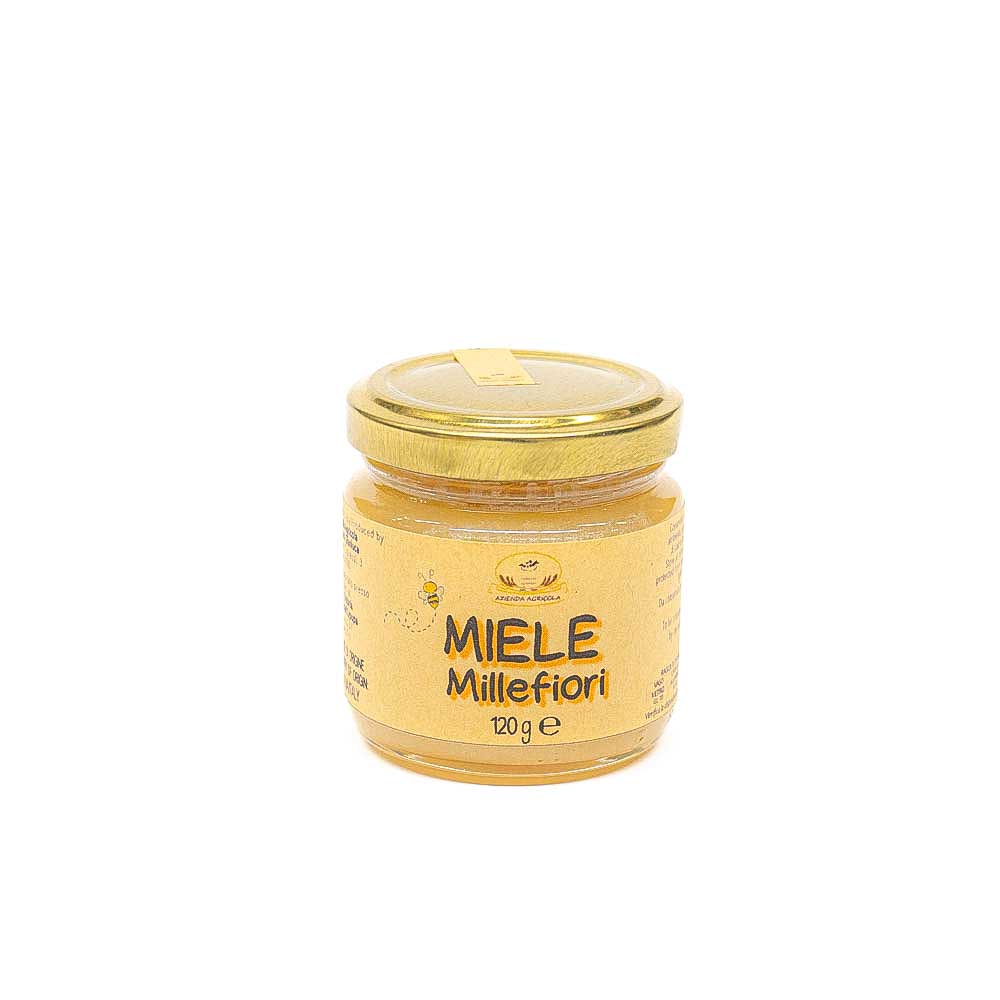 Miele Millefiori 120g. Le nostre api nel periodo primaverile-estivo, grazie alla fioritura di trifoglio, ed altre graminacee, producono un ottimo miele millefiori dal colore chiaro e gustoso.